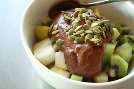 Anyway, tout ça pour dire que je me régale toujours de cette tartinade! J’aime particulièrement me préparer un gros bols de fruits (kiwis, bananes, poires, fraises, pêches, etc.) puis de recouvrir le tout de ma «fondue» au chocolat.