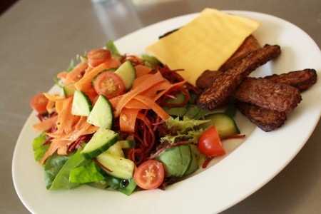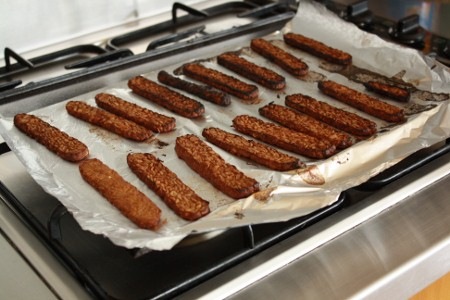 4. Préchauffez votre four à broil. Déposez vos tranches de tempeh marinées sur une plaque de cuisson recouverte de papier d’aluminium vaporisée d’huile. Cuire de chaque côté jusqu’à ce que les tranches commencent à noircir (ou avant, selon vos goûts). Faites attention, ça brûle vite à Broil! Je l’ai ai laissé 10 minutes d’un côté et 6 minutes de l’autre mais je pense que notre Broil (Grill en Australie) ne fonctionne pas correctement.