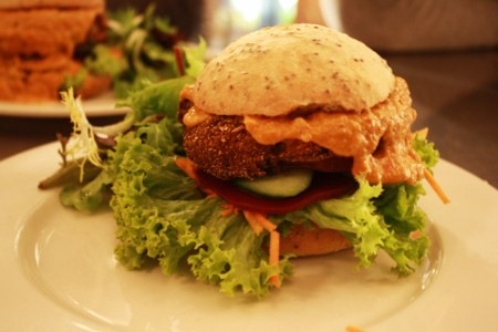 Le végé-burger aux lentilles a combler toutes mes attentes et même plus! La boulette épicée, la sauce satay (sauce aux arachides), la montagne de salade et le pain bien dodu formaient le burger parfait. Même s’il me peine de le dire, je pense que leur burger aux lentilles est meilleur que le mien. A little part of me just died… 😦