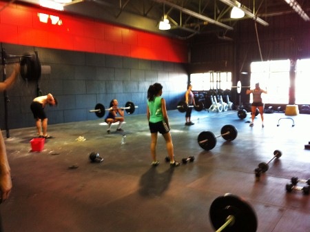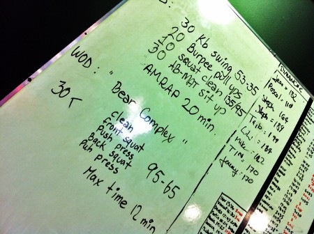 Je n’ai pas réussi à compléter 30 Bear Complex en 12 minutes mais je me suis rendue à 24 avec la barre de 45 livres ce qui n’est quand même pas si mal. Toutefois, comme vous pouvez le voir dans la photo plus haut, toutes les autres filles avaient du poids en plus sur leur barre… Oh well, ce n’était probablement pas leur troisième fois. De toute façon, j’aime mieux me comparer à moi-même et essayer de me dépasser d’une fois à l’autre quand il s’agit d’entraînement.