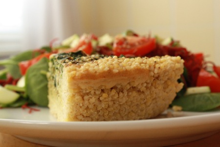 Comme je vous le disais il y a quelques jours, j’ai reçu quelques membres de ma famille à souper lundi dernier. Je voulais essayer la quiche en croûte de millet d’Ashley depuis longtemps mais j’attendais de recevoir un petit groupe pour le faire (sinon j’en aurais mangé pendant des jours). J’ai légèrement modifié la recette pour la rendre ovo-végétarienne puisque ma soeur est intolérante au lactose. Sentez-vous libre de l’adapter à votre goût!