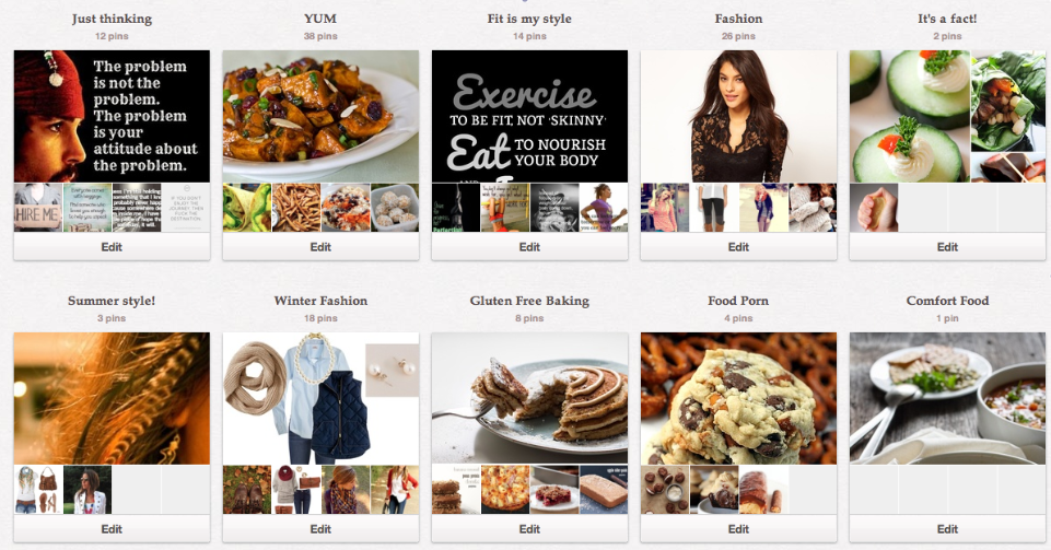 Il est possible de créer plusieurs tableaux selon vos intérêts comme la mode, la photographie, le fitness, les citations inspirantes, les recettes végétaliennes, végétariennes, sans gluten, décadentes, etc. Voici une capture de quelques-uns de mes tableaux…