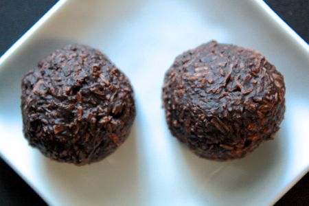 2. Pour la déshydratation : À l’aide de vos mains mouillées, roulez des boules de 1 pouce de diamètre et placez-les sur une grille du déshydrateur. Déshydrater de 12 à 28 heures à 105F (la recette originale déshydrate à 115F). Placez les macarons dans un plats hermétique jusqu’au moment de déguster.