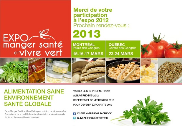 L’Expo Manger Santé et Vivre Vert sera au Palais des congrès de Montréal ce weekend et le suivant au Centre des congrès de Québec, ne manquez pas ça! Avec les années, les même exposants reviennent mais on tombe toujours sur de nouveaux produits malgré tout et ça nous donne l’occasion de goûter à tout plein de nouveaux trucs. J’y vais ce dimanche avec ma soeur et, après une année d’absence, j’ai bien hâte de voir ce que l’édition de 2013 aura à nous proposer. Pour voir mon retour sur les anciennes éditions :