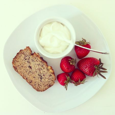 Je l’ai servi avec du yogourt de chèvre aromatisé grâce à du stévia à la vanille (vous pourriez simplement ajouter du sirop d’érable et de la vanille) et des fraises fraîches. Les fraises que l’on retrouve en épicerie sont vraiment savoureuses ces temps-ci mais j’ai encore plus hâte aux fraises du Québec!