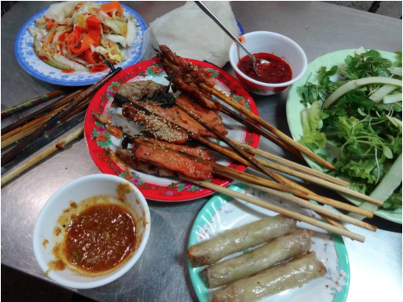 À Hoi An, le Bánh xèo est composé d’un rouleau de crevettes, d’une brochette de porc, de légumes émincés et d’herbes aromatiques, le tout enroulé dans une feuille de riz et trempé dans une délicieuse sauce aux arachides. En version deluxe, on ajoute également une petite omelette frite, qui constitue la base du Bánh xèo dans les autres provinces vietnamiennes.