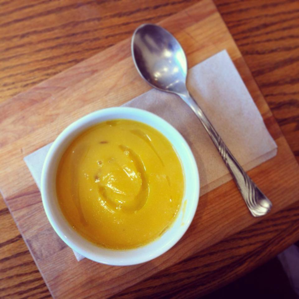 Ce jour-là, nous avons eu droit à un potage à la courge (sans crème ni bouillon – je m’informe toujours à savoir s’il y a du bouillon de poulet dans les soupes et le chef m’a répondu qu’il n’utilisait jamais de bouillon, que de l’eau et des épices j’imagine) en entrée. Par la suite, mon choix s’est arrêté sur le grilled-cheese (un mélange de brie et de chèvre) et o.m.g… Il était absolument énorme mais ça ne m’a pas empêché de le dévorer jusqu’à la dernière bouchée. Je devrais m’en faire plus souvent à la maison!