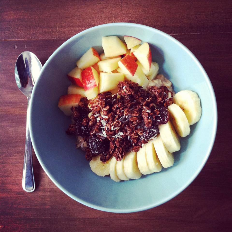 On dirait que je fais une fixation sur le granola maison depuis le début de l’année (évidences : granola au beurre d’arachides et chocolat + granola au coconut et beurre d’amandes + les autres que j’ai essayées mais qui ne valaient pas la peine d’être blogué. Je suis sélective quand même, je ne vous présente pas n’importe quoi!). Possiblement parce que je fais une vraie fixation sur les mueslis depuis mon voyage à Chicago en juin 2013. «Fixation» dans le sens où j’en mange au moins 5 fois par semaines et, si je passe plus de trois jours sans en manger, je m’ennuie. Je blâme celui du Corner Bakery Cafe et celui de Corinne. Quoi de mieux pour accompagner ces mueslis qu’une bonne dose de granola croquant? Hein? Hein? Nada…