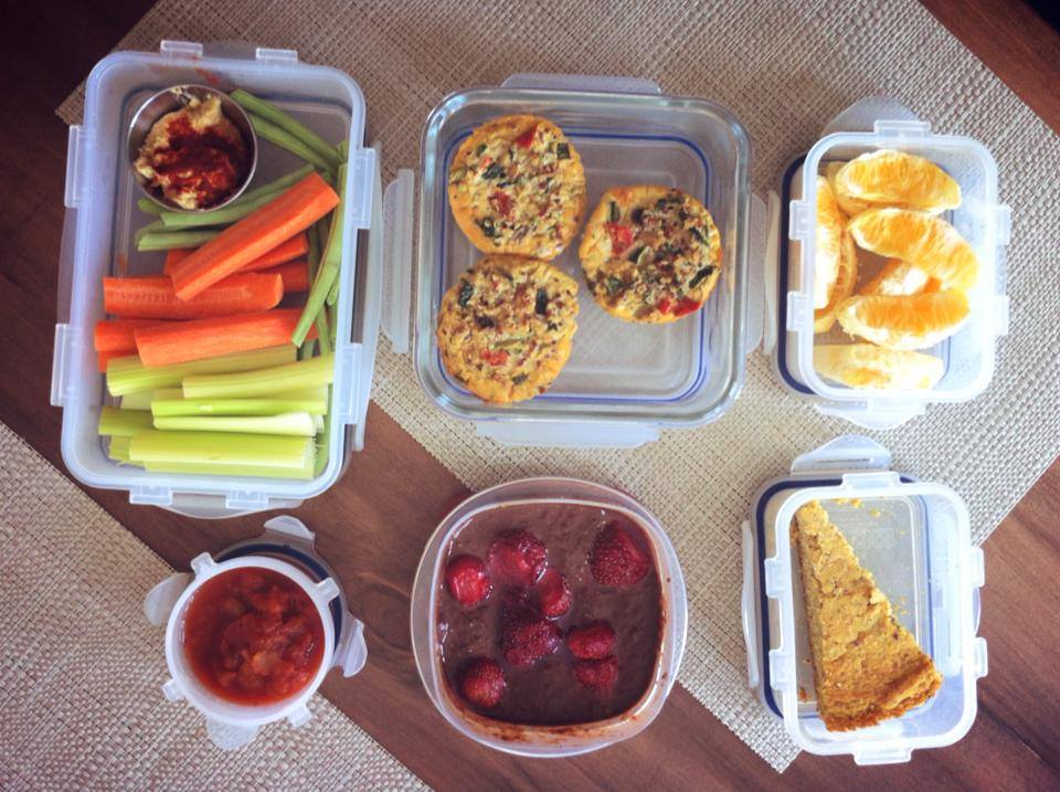 Des petites quiches au quinoa et aux légumes servies avec de la salsa, des crudités avec de l’humus, un morceau de pain de maïs, une orange et un pouding protéiné Vega au chocolat avec des fraises décongelées plus une orange.