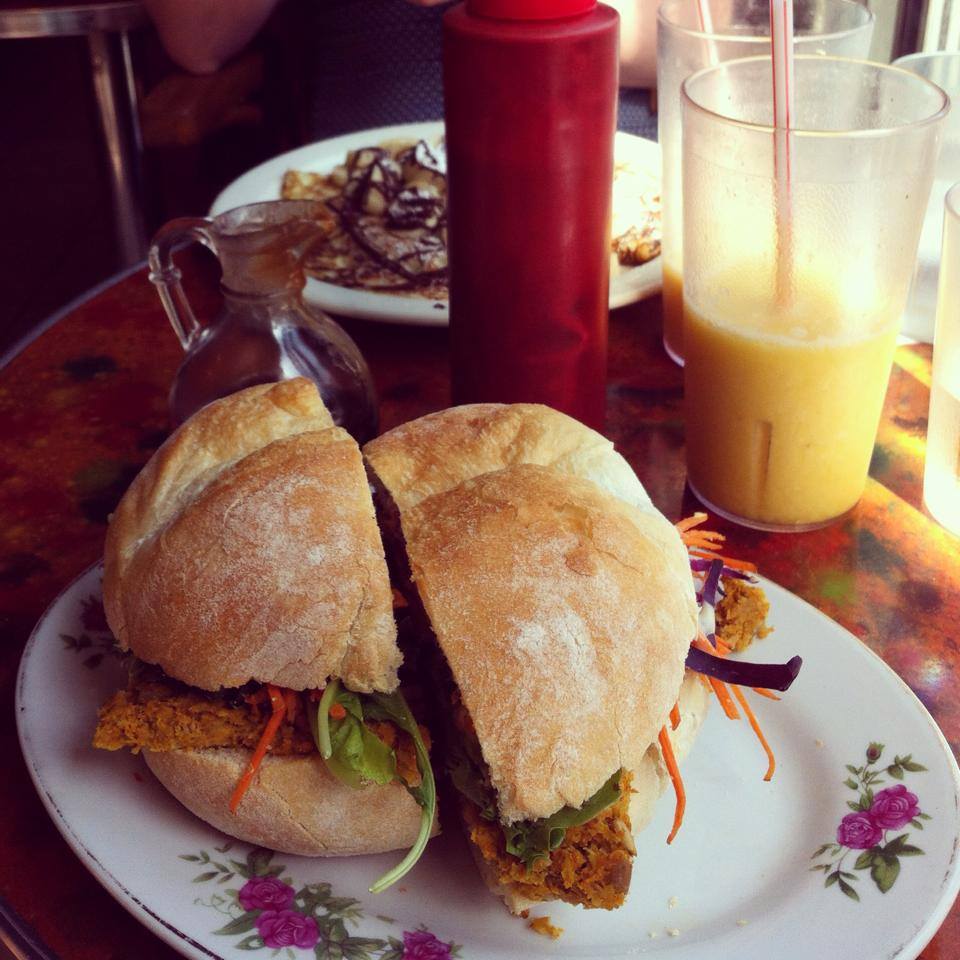 C’était ma première visite chez Chez José sur Duluth mais certainement pas ma dernière! Ce petit restaurant aux inspirations portugaises sert de loin le meilleur sandwich au végé-pâté en ville. J’y suis allée pour le brunch donc j’ai commencé mon repas par un délicieux cappuccino au lait de soya suivi d’un grand smoothie (le Pacific Dream) à l’orange, mangue et banane. Le plat de résistance, ce gigantesque sandwich au végé-pâté, vient garni de guacamole, légumes frais, laitue, fromage et mayo. La prochaine fois, je le prendrai sans fromage car le goût de ce dernier ne se mariait pas très bien au reste du sandwich selon moi.