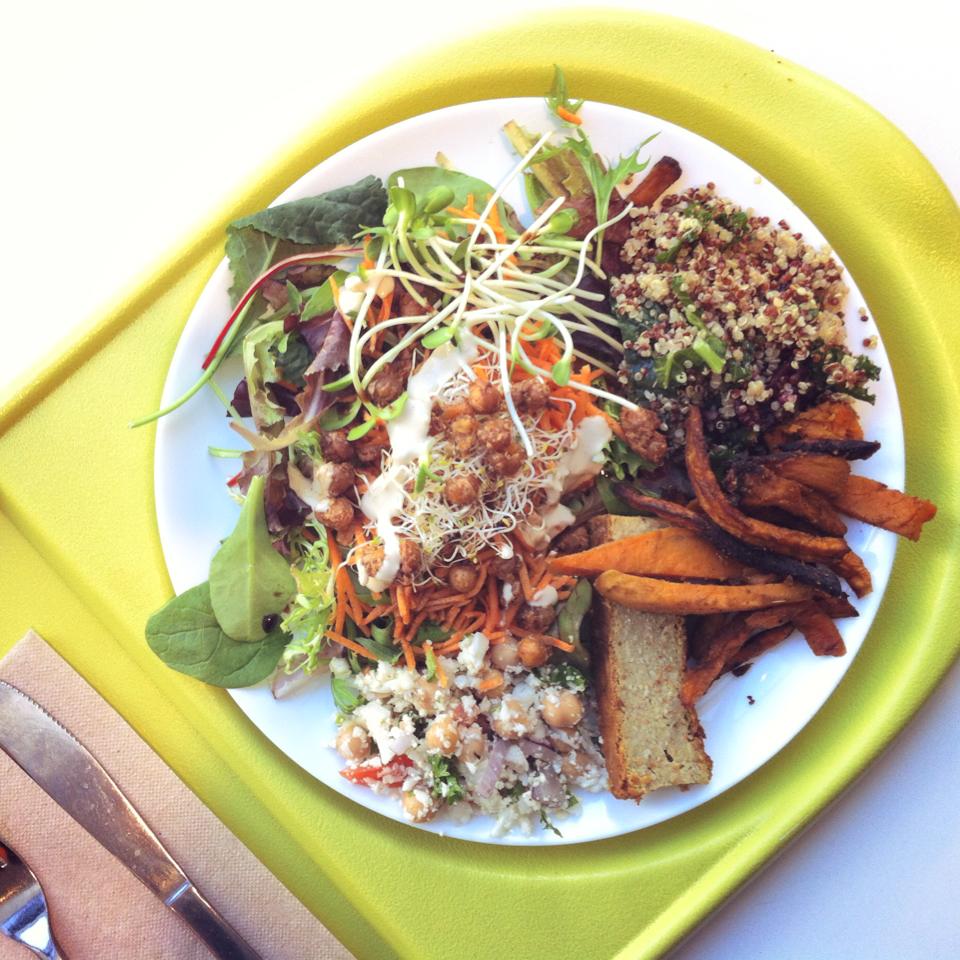J’avais à faire au centre-ville à mon retour de voyage alors une visite chez Végo sur Ste-Catherine s’imposait. J’ai mes favoris dans ce buffet végétarien mais j’essaie toujours au moins un truc de nouveau pour laisser la chance au coureur. Je commence toujours mon assiette avec une grosse salade verte garnie de légumes, pousses et vinaigrette (la crémeuse au vinaigre balsamique est extra!). Généralement, j’ajoute du fêta mais il n’y en avait plus lors de ma visite alors j’ai opté pour les pois chiches rôtis, une nouveauté. Ils étaient excellents! Je prends également toujours la salade de kale et quinoa ainsi que du végé-pâté. J’ai essayé leur «coucous» de chou-fleur et bof, trop santé pour moi. Les frites de patates douces étaient bonnes mais la moitié n’étaient pas assez cuites. Avez-vous déjà mangé de la patate douce crue? Assez ordinaire… J’ai hâte d’y retourner déjà! J’ADORE la formule buffet qui fait qu’on peu manger un peu de tout!