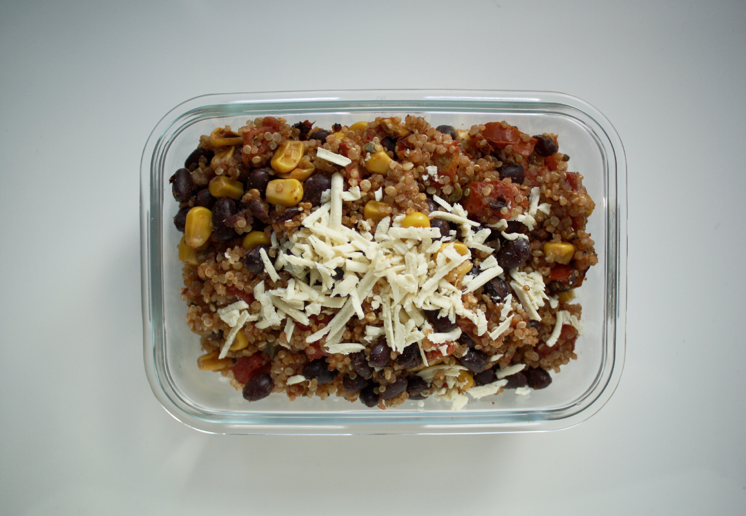 Que diriez-vous d’une nouvelle recette aujourd’hui? Ça fait un bail que je n’ai rien présenté de nouveau sur le blogue et c’est encore pour les deux mêmes raisons : un, je fais souvent les recettes de mes archives (j’en ai des tonnes, je sais qu’elles sont bonnes et le copain ne les a pas toutes goûtées encore) et, deux, je ne suis pas toujours inspirée pour prendre des photos. J’ai fait cette recette de quinoa à la mexicaine le mois dernier, mais on a fini le plat avant que je ne trouve le courage de sortir mon appareil. Cette fois, je me suis dit que je ne laisserais pas passer l’occasion mais j’ai failli oublier quand même. Voilà pourquoi la recette est présentée bien sommairement dans un plat à lunch. Oh well, on s’entend que ce n’est pas pour les jolies présentations et les photos professionnelles que vous venez ici. Ça m’arrive de faire des efforts mais pas aujourd’hui.
