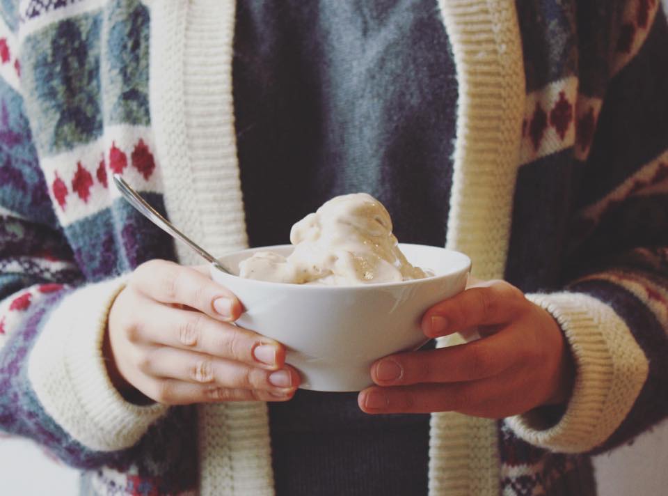 J’espère que vous passez un bon début de semaine! Que diriez-vous d’un retour sur quelques-unes de mes plus récentes publications facebook en commençant avec la glace à la banane que vous voyez ci-haut. Ce n’est pas parce qu’on gèle que ça va m’empêcher d’en profiter! J’empile les gilets de laine et hop, le tour est joué! Honnêtement, je trouve ça aussi bon, sinon meilleur, que de la crème glacée ordinaire. Particulièrement celles au soya qui manquent souvent de goût. Puisqu’on la fait nous-même, on peut vraiment y ajouter ce que l’on veut. Beurre de noix? Cacao? Caramel? Sirop d’érable? Biscuits? You name it!