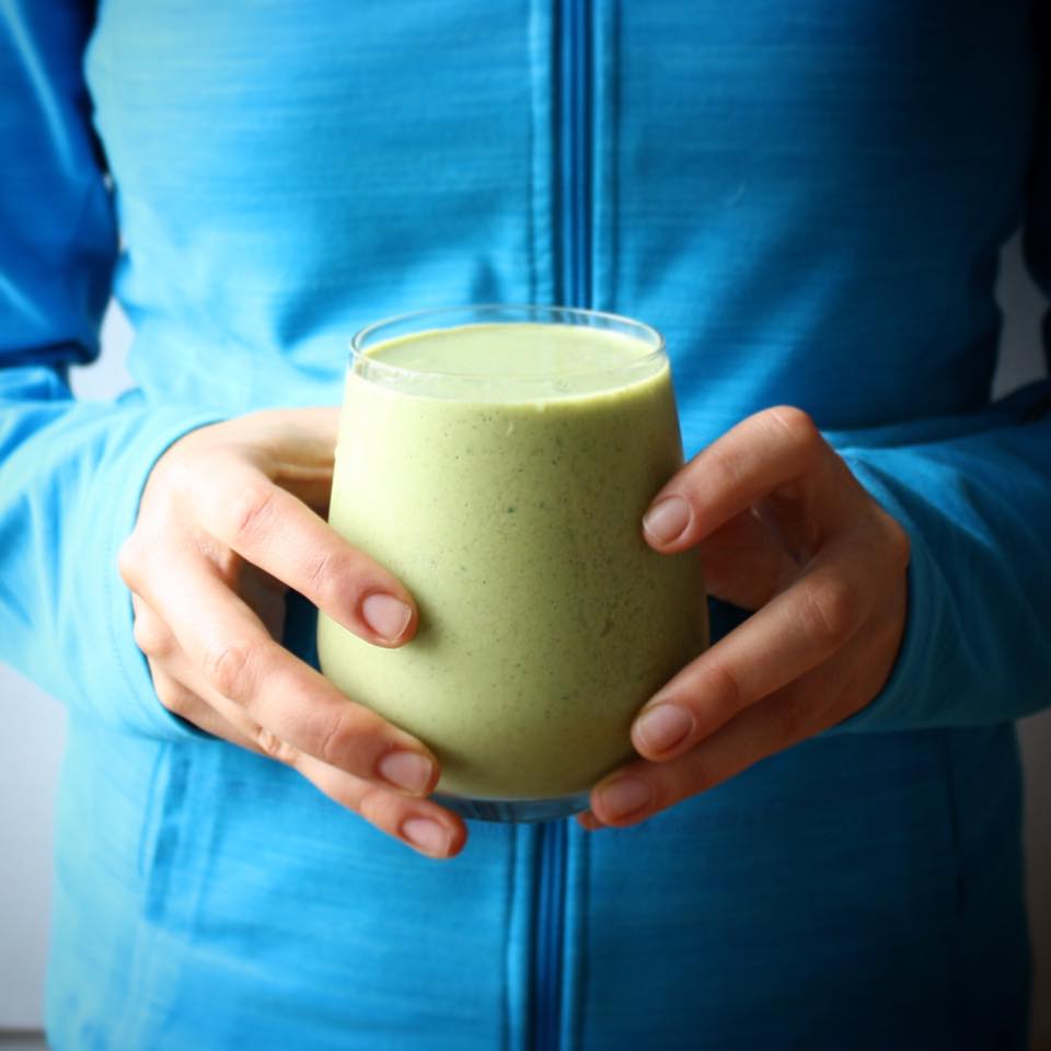Ma collation post-workout (et, honnêtement, à tout moment de la journée) de prédilection : un smoothie! Celui-ci contenait : du lait de soya, de la poudre de protéine Sunwarrior à la vanille, des épinards, du céleri, des bananes, de la mangue, de la cannelle et du gingembre. Triple fois yum!