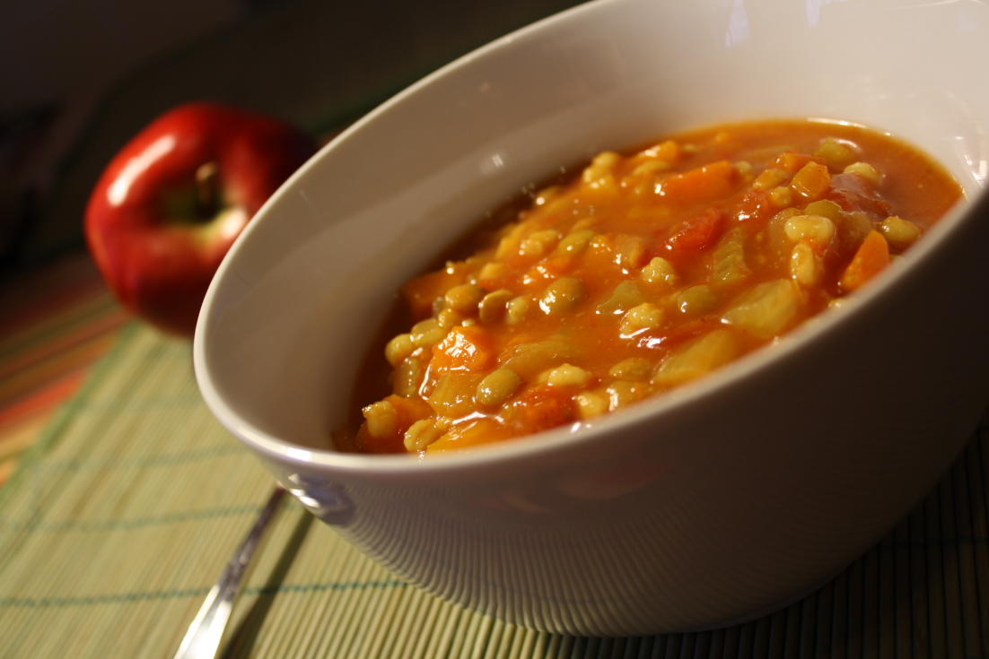 De retour à la maison, je me suis versé un bol de soupe à la courge, aux lentilles et à l’orge perlé avec la pomme Rouge Délicieuse que j’avais amenée comme lunch mais pas eu le temps de manger.