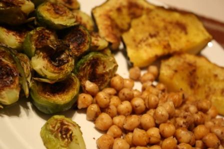 Pour souper, j’ai voulu faire découvrir à ma mère la courge poivrée. Et bien, je suis désolée pour ceux qui serait tenté d’y goûter maintenant mais il semblerait que les courges ne soient plus trop de saison. Elle était vraiment pleine d’eau. Peut-être parce que ma mère l’avait conservé au réfrigérateur. Par chance les choux de Bruxelle et les pois chiches ont sauvé la situation! Fait étrange, il n’y avait rien de croustillant comme lorsque je les cuit dans mon four. Peut-être faudrait-il augmenter la température à 450 (plutôt que 400) pour ceux qui ont un four paresseux…