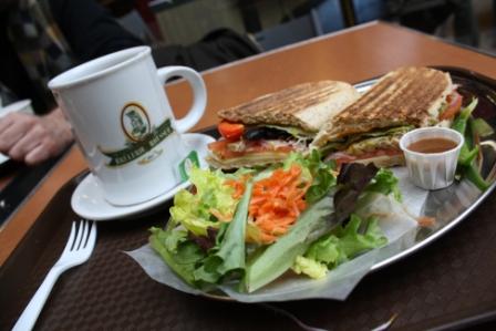 Heureusement, le 2e service n’a pas mis bien longtemps à nous rejoindre! J’ai choisi le panini de blé entier végétarien : ok, mais sans plus. Je n’aime pas les olives et, en les enlevant, il ne restait qu’une tranche de tomate, une tranche de fromage et une feuille de salade… Par chance, il y avait du pesto de tomates séchées!