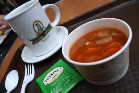 Pour dîner, mon père m’a amené dans une petite brûlerie des Halles de Ste-Foy. J’ai vécu ma première expérience végétarienne de : «Pardon, quel bouillon a été utilisé dans cette soupe?». Finalement, le potage aux carottes contenait du bouillon de poulet alors j’ai opté pour la soupe aux légumes à base de bouillon de tomates. Habituellement, j’aime moins les soupes que les potages (je ne sais pas, l’idée de petit morceaux qui flottent…) mais celle-ci était excellente! J’étais tellement affamée, j’en aurais mangé trois fois comme ça!