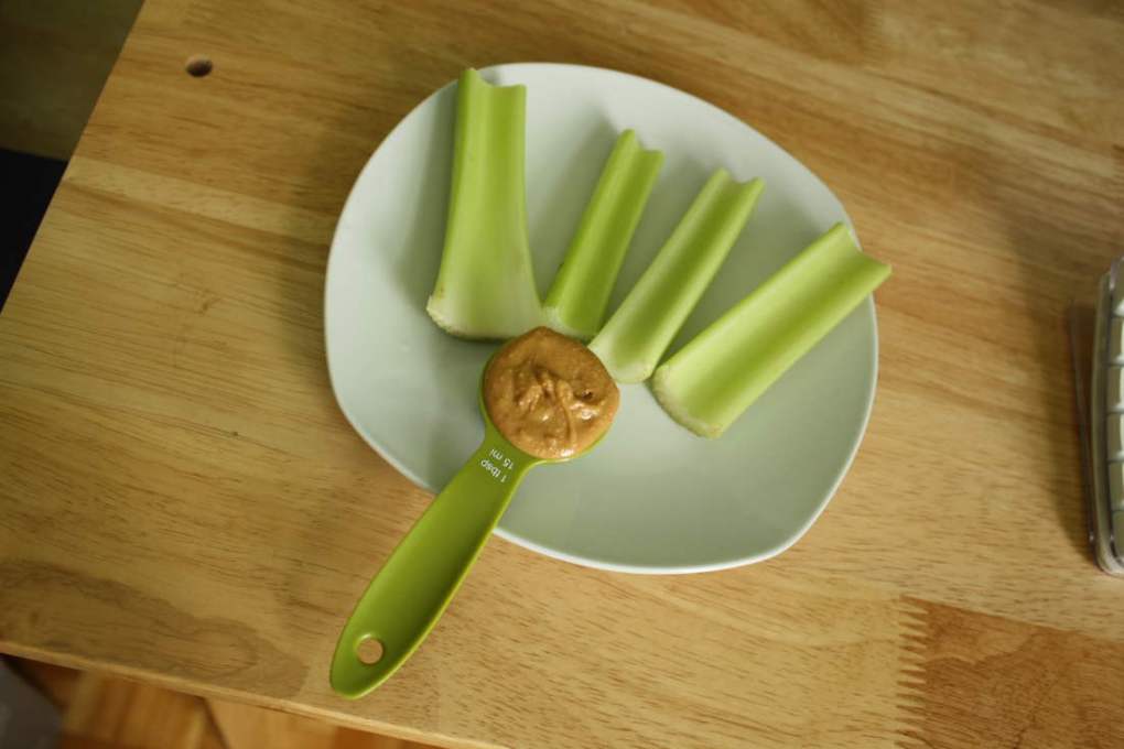 À mon retour du gym, j’avais besoin d’un petit remontant… Quelques branches de céleri + beurre d’arachide (2 c. à soupe) ont fait la job.