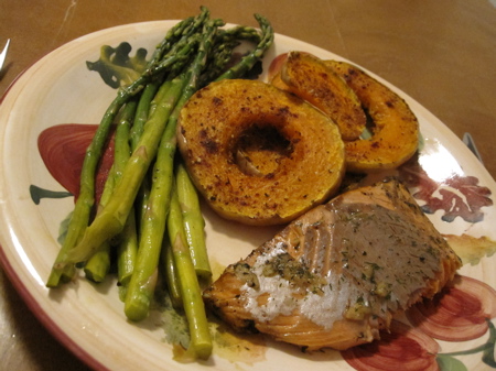 Pour souper, je n’ai eu qu’à m’asseoir et déguster! Asperges en papillotte sur le BBQ, truite saumonée au gingembre (également sur le BBQ) et courge butternut cuite au four avec de la cannelle.