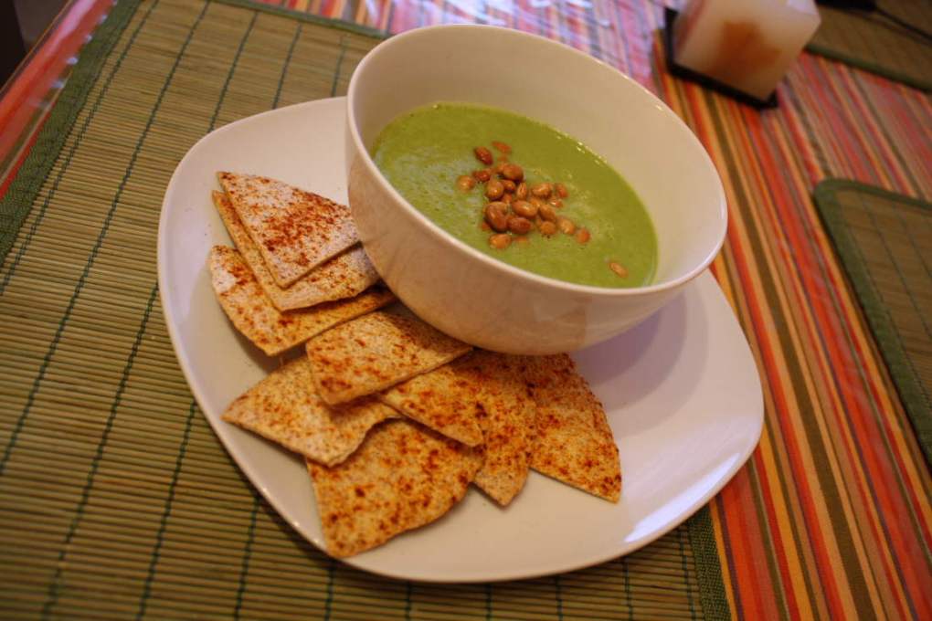 J’ai décoré mon potage avec quelques graines de soya rôties non-salées et accompagné le tout de croustilles de tortillas (voir la recette de dimanche soir). Je vais tenter de créer ma propre recette de potage aux petits pois très prochainement.