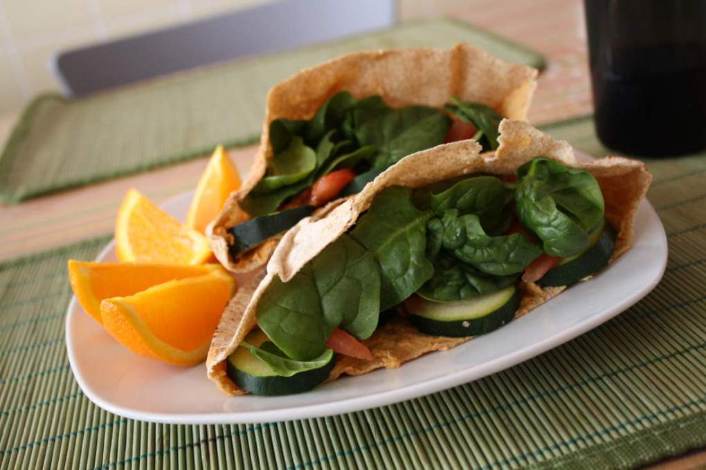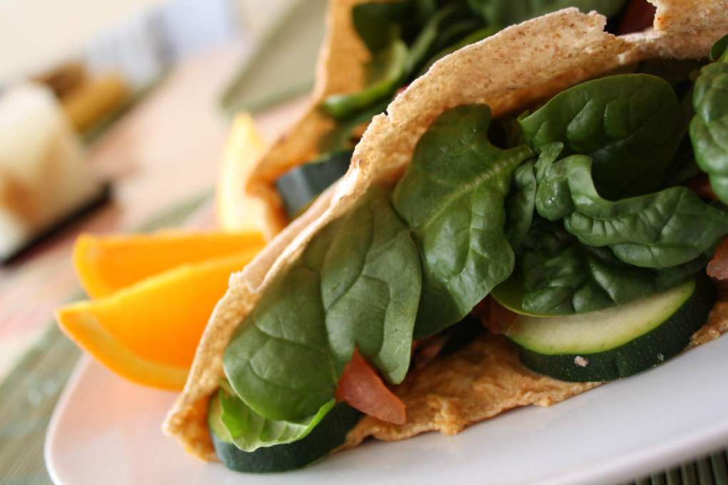 En revenant du gym ce midi, je me suis fait un pita à l’humus à l’artichaut et aux légumes (épinards, tomate et courgette).