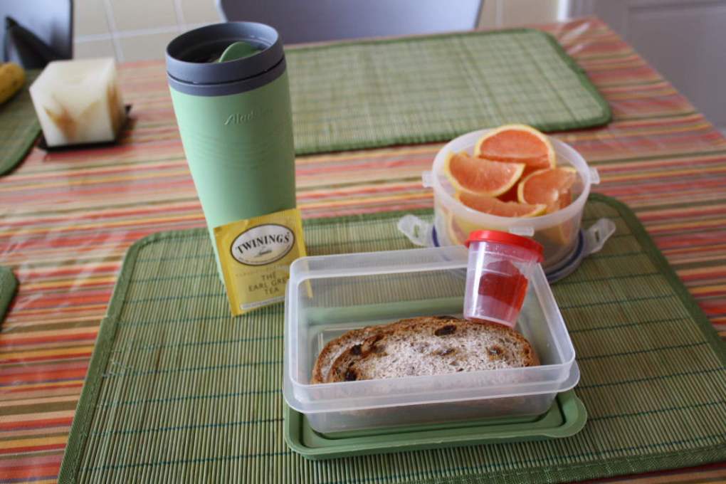 - 2 tranches de pain aux dattes et aux noix maison (le pain est congelé sur la photo mais je l’ai rôti avant de partir ce matin)