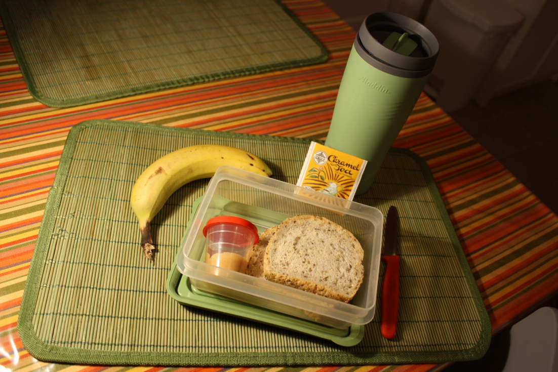 - 2 tranches de pain aux grains germés Première Moisson (que j’ai grillées un peu avant de partir)