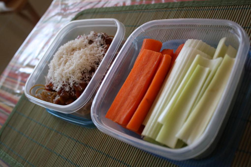 Dans ma boîte à lunch : une montagne de crudités et un restant de spaghetti sauce aux légumes et aux pois chiches généreusement saupoudré de parmesan. Je salive juste à voir la photo… Vivement que j’arrive à l’école!
