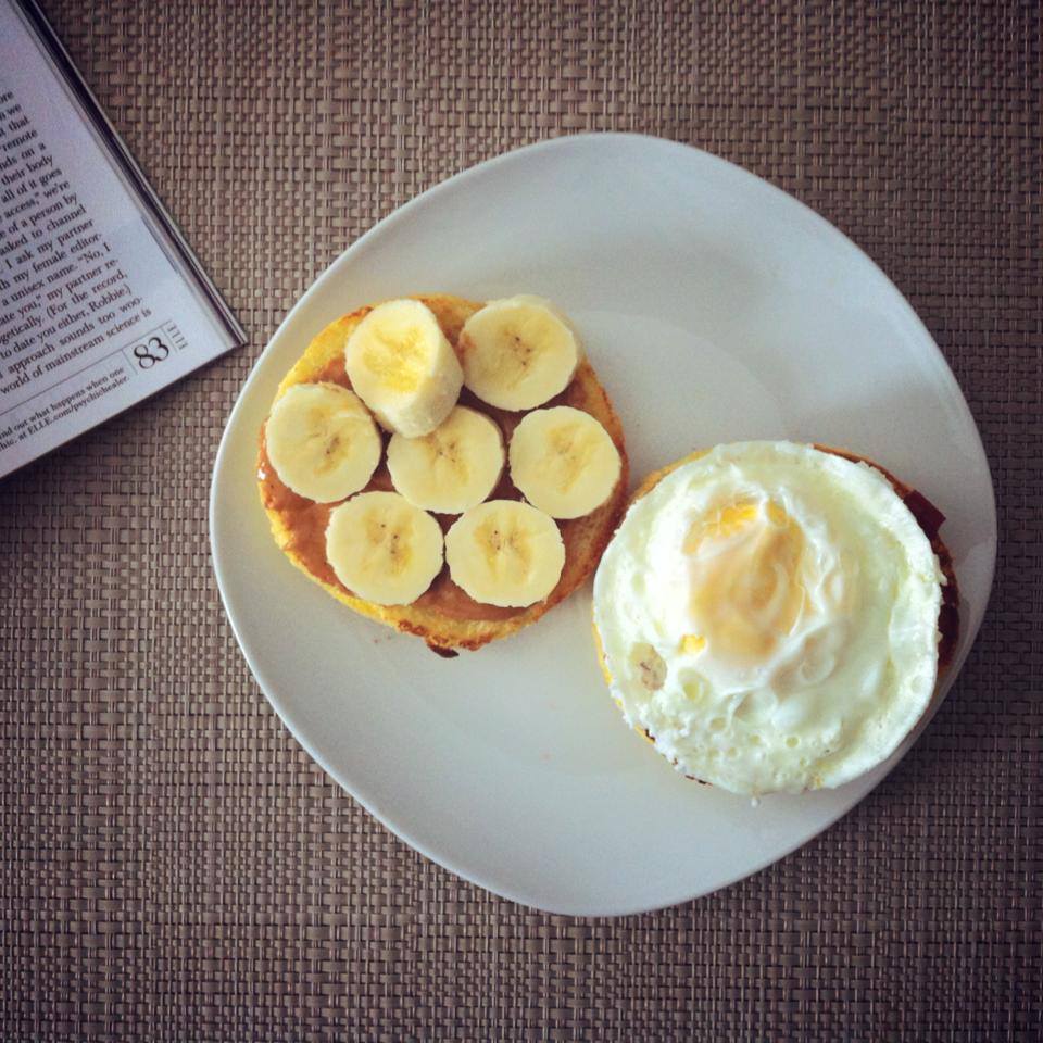 Mon déjeuner/lunch préféré du moment! Je pourrais sérieusement manger ce repas matin-midi-soir pendant 100 jours sans me tanner. J’ai presque le goût d’essayer pour voir… 😉 Je me suis gâtée et j’ai acheté des muffins anglais sans gluten Glutino («je me suis gâtée» dans le sens où ça coûte une petite fortune ces trucs-là alors je n’en achète jamais mais, cette semaine-là, ils étaient en rabais chez Métro). J’en tartine un de beurre d’arachides naturel avant d’ajouter des rondelles de bananes et le deuxième se fait généreusement tartiner de confiture de fraises avant d’être garni d’un oeuf cuit. Pour ceux qui ne sont pas opposés au micro-ondes, la façon la plus rapide de cuire un oeuf : cassez votre oeuf dans un bol ou une tasse à mesurer (en verre, ne chauffez jamais de plastique au micro-ondes!), déposez le bol au micro-ondes et faites cuire de 60 à 65 secondes. Laissez refroidir quelques instant avant de soulever votre oeuf cuit à l’aide d’une cuillère. Ta-dam! Un oeuf prêt en une minute top-chrono! Difficile à battre non?