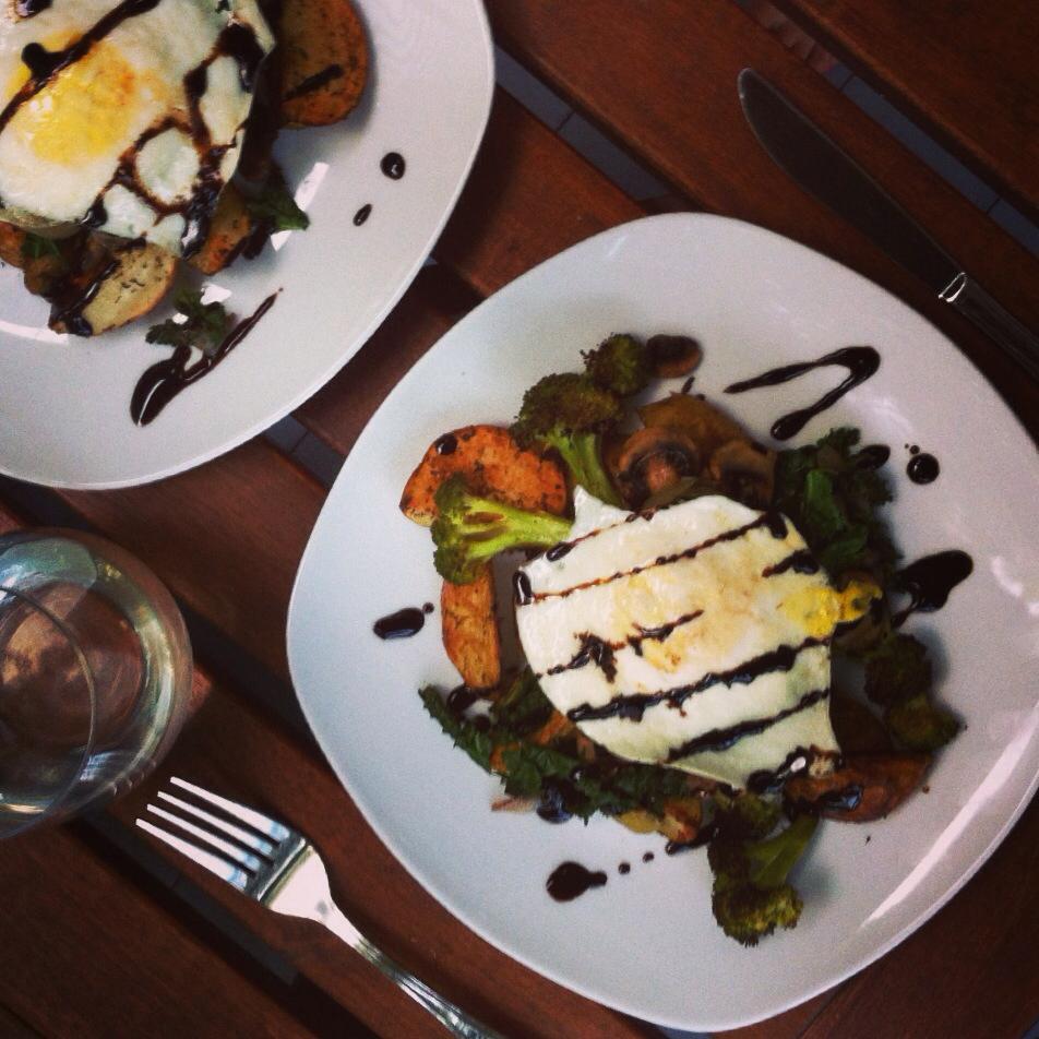 - Pour servir, déposez la moitié des patates et brocoli dans chaque assiette, recouvrez de la moitié de la préparation de kale, oignon et champignons, ajoutez l’oeuf et garnir de votre réduction de vinaigre balsamique.
