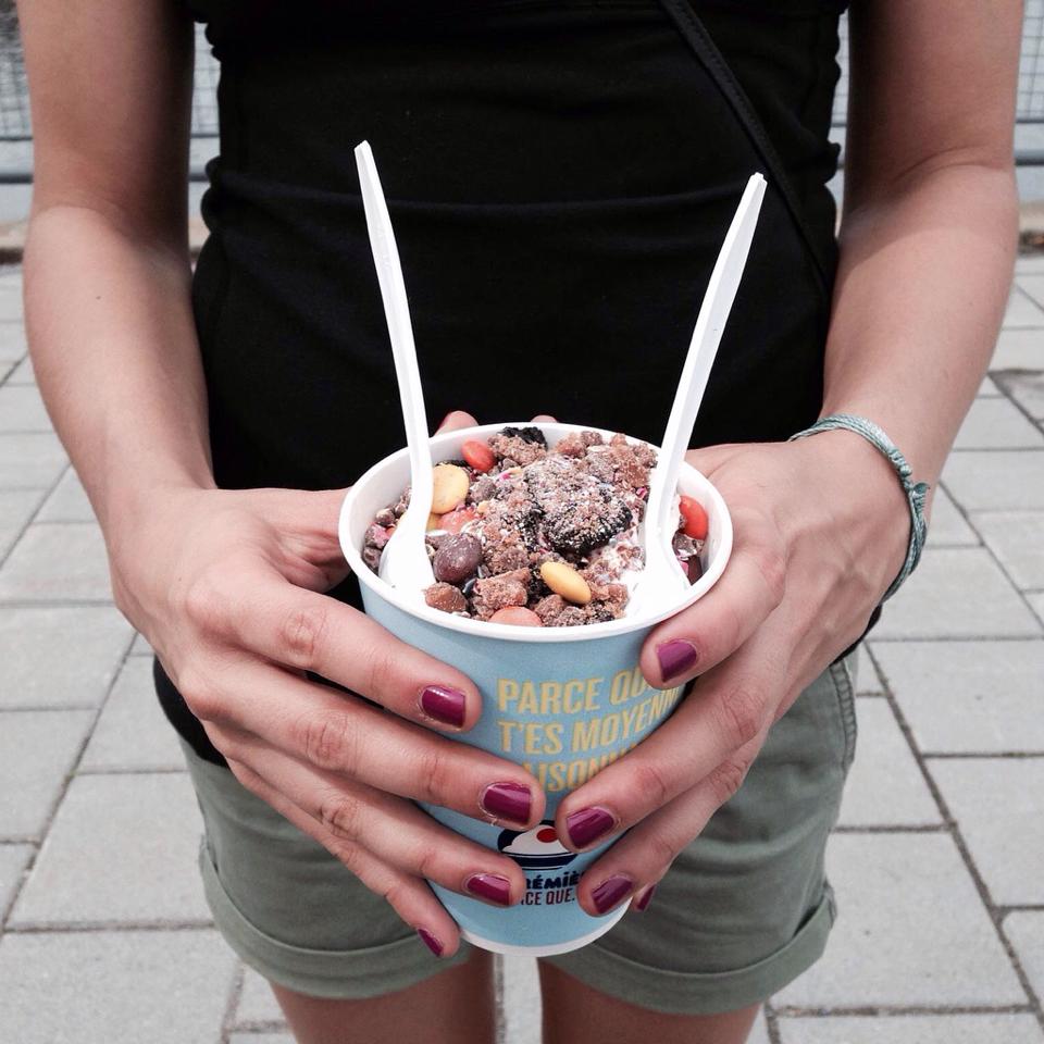 Cette fois-là, nous avions pris nos vélos jusqu’au Vieux-Port pour se promener et déguster une crème glacée. Cette monstruosité est un Tourbillon de La Crémière avec toutes les garnitures qui contenaient du chocolat (Oreos, Rolos, Smarties et Reeses’ pieces). Ma-la-de. Ben oui que j’allais en prendre 2-3 bouchées. C’est mal me connaître… 😛
