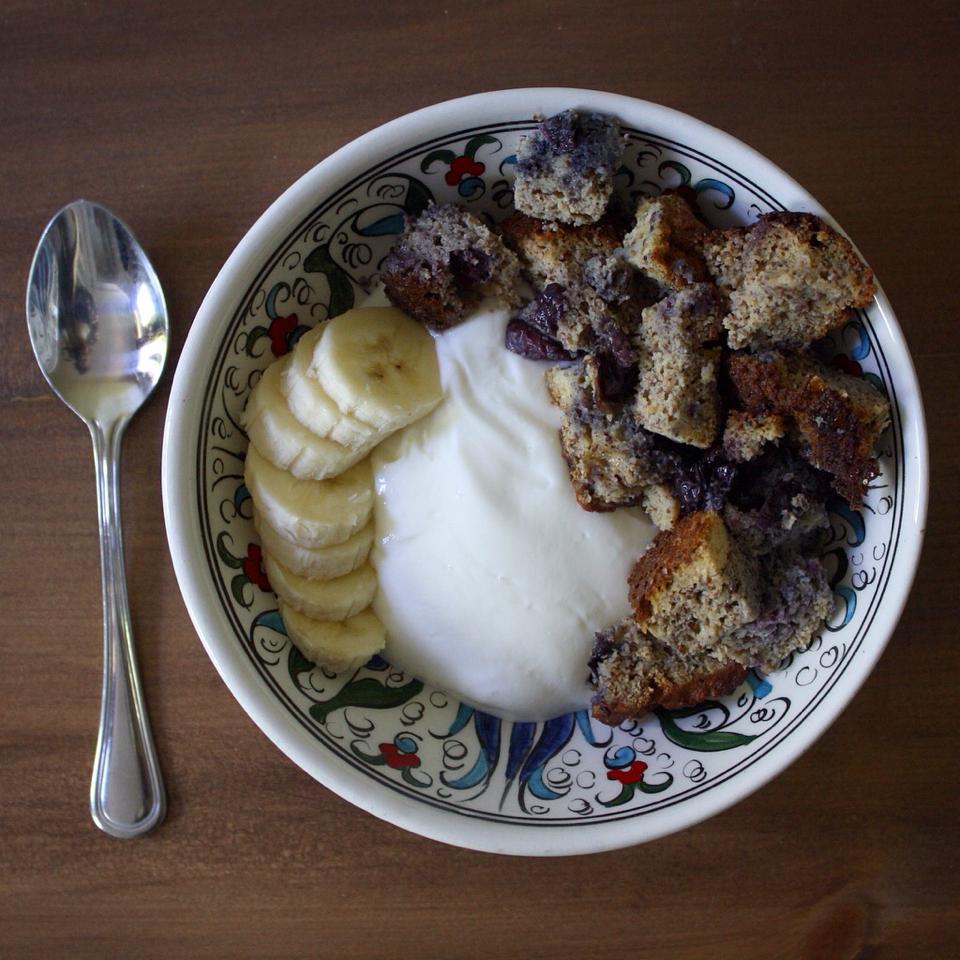 Un autre petit-déjeuner que j’affectionne : les bols de yogourt garni de morceaux de muffins ratés. Vous savez ces muffins trop épais, trop secs, trop mous, etc? Voici la meilleur façon de les récupérer! J’irais même jusqu’à dire que la texture d’un muffins dans du yogourt est meilleure que de la crème glacée avec une tarte chaude. J’échangerais l’un pour l’autre n’importe quand!